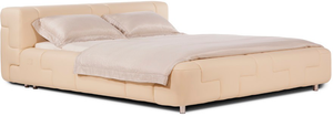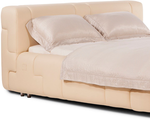 White leather with Russian geometry display a strong sense of line and elegance. This unique bed frame design is breaking traditional with a generous and warm look. This bed is called “Kiss from God”, the squares in the tail/foot are like milestones creating a master craftsman’s feel.