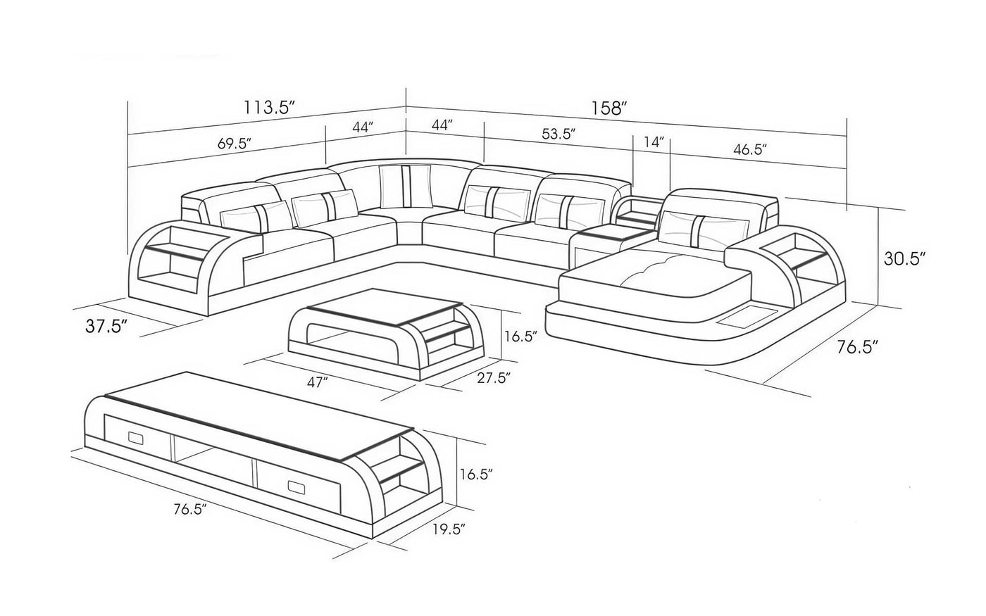 • Default sets Include 1 Sectional (1*LAF Chaise + 1*Armless Loveseat + 1*Corner +1*RAF Loveseat), 6 Throw Pillows, 1 Console Table, LED light with the switch.