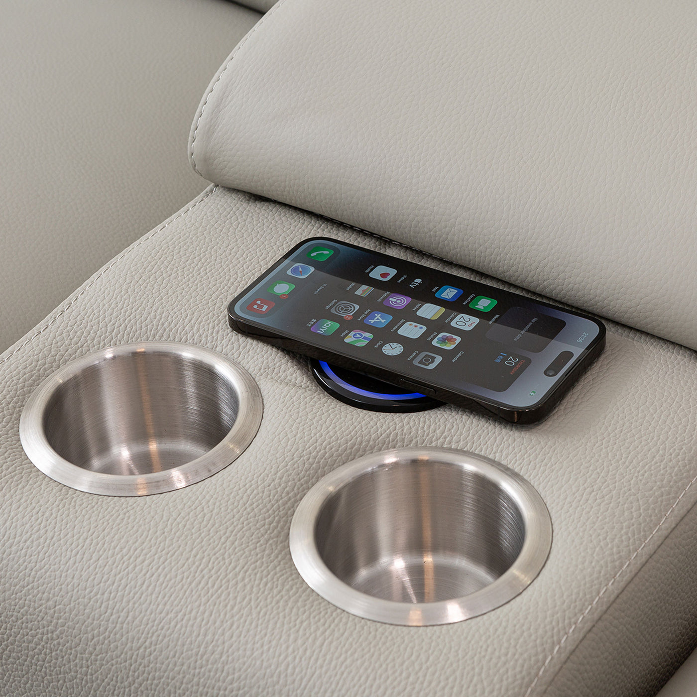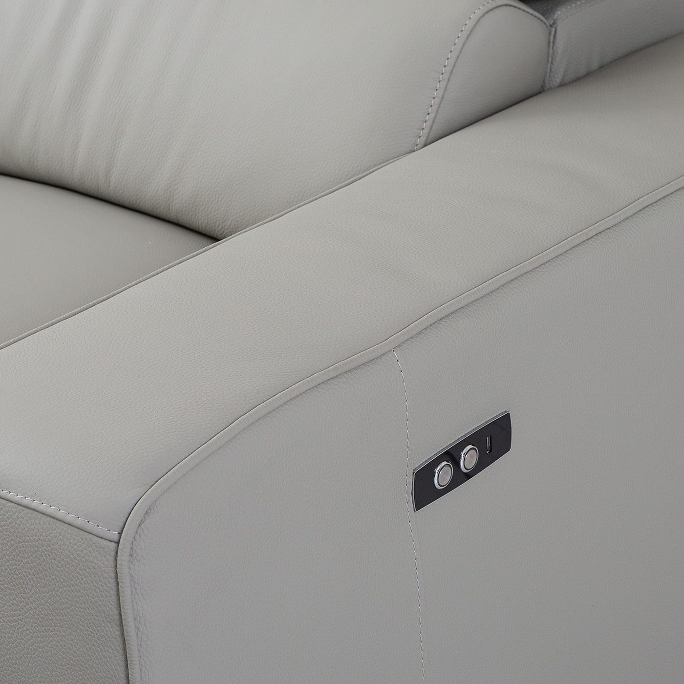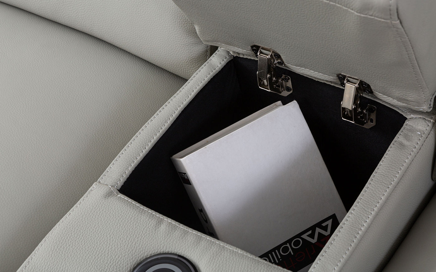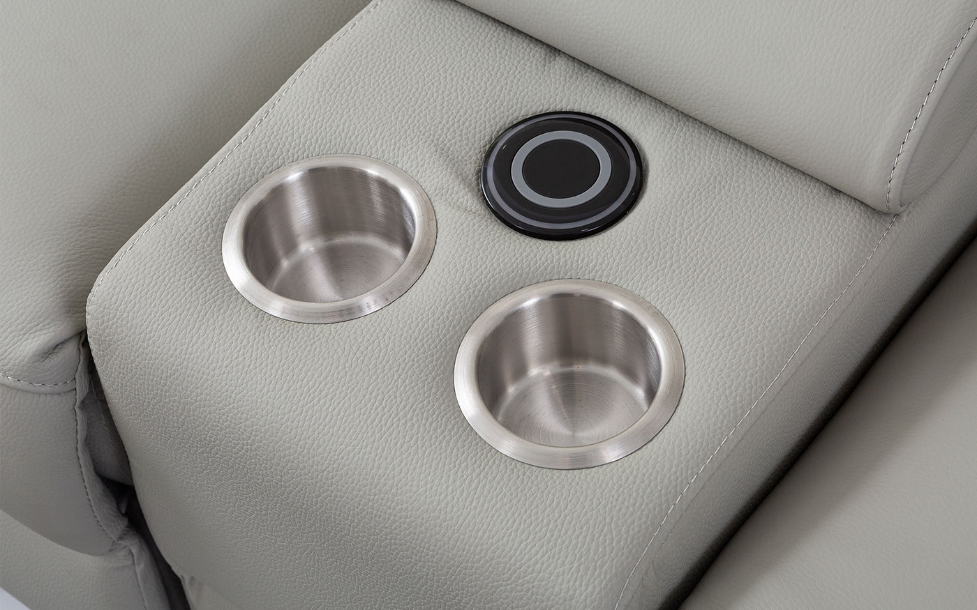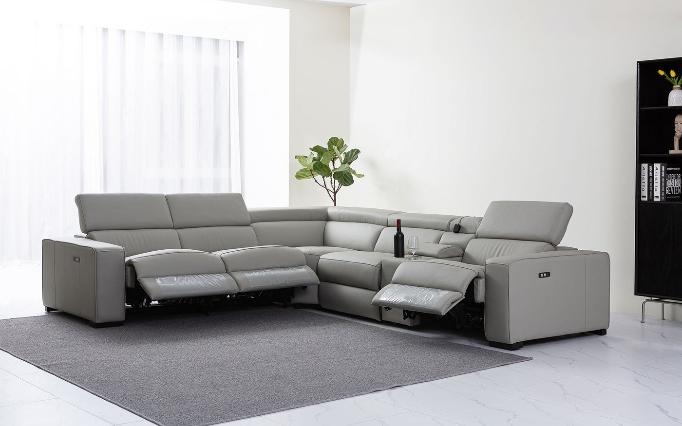 Smart and cozy choice for your living room. This spacious sectional features two recliners, a console table with storage space, two outlets, and four USB ports. This sectional has two recliners that let you adjust your position with a touch of a button. The armrests also have USB ports and side storage compartments for your convenience. You can choose from fabric or top-grain Italian leather upholstery in various colors to suit your taste. The sectional is filled with high-density foam for comfort and durability, and has side tufting and brushed stainless steel legs for a sleek look.