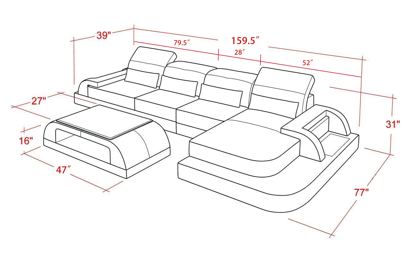 • Default sets Include 1 Sectional (1*RAF Chaise +1*LAF Loveseat+1*Armless Chair), 4 Throw Pillows, LED light with the switch + Coffee Table