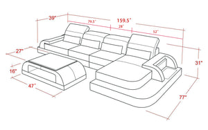 The Brosnan Leather Sectional with LED lighting is handmade with genuine Italian or bonded leather. This large leather sectional is sleek and suits any modern living space. Its modular design can be customized to a configuration that fits your unique space - whether it is your living room or family room. Armrests are included to hold drinks and personal items. The storage space alongside the chaise is big enough to display books or decorative items. The spacious chaise is perfect to lay down and rest after a busy day. The side of this leather sectional are illuminated by a LED light. It can be optionally upgraded to multi-color lights that can be controlled by a wireless remote. Choose your configuration left hand facing or right-hand facing chaise to customize to your desired design. This sleek, comfortable sectional is a must have for every contemporary home. To complete the look of your living space we recommend adding the armless chair and coffee table. Cup holders and USB ports are recommended for larger families to optimize maximum enjoyment. An additional bed function makes a great movie night with the family or space for unexpected guests. With the generous size of this sectional, family and friends will gladly socialize in comfort.