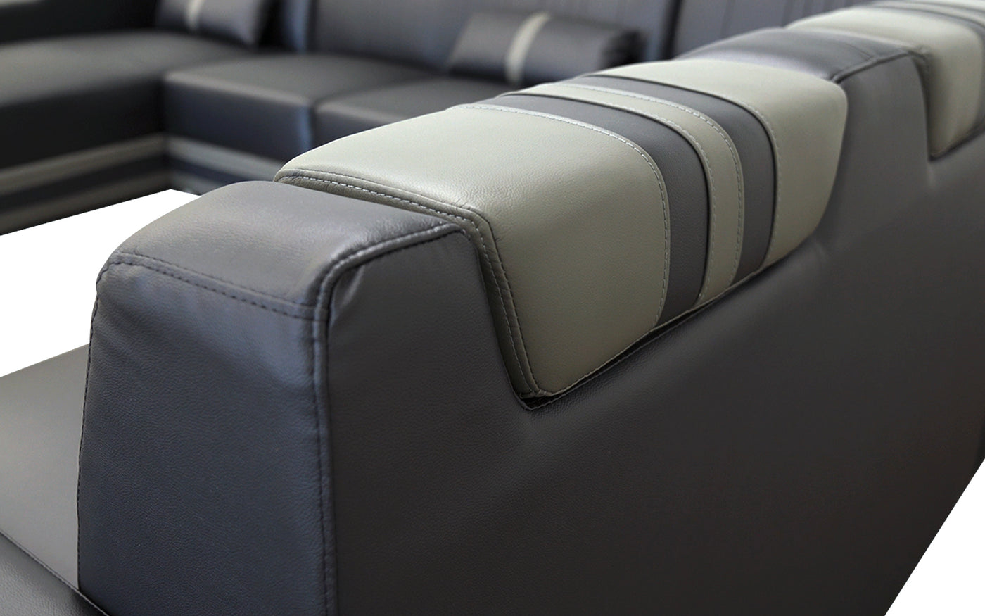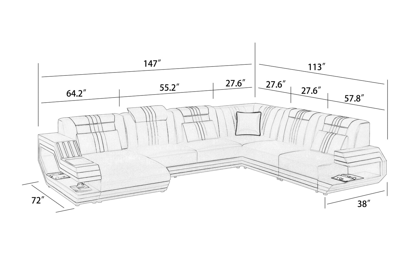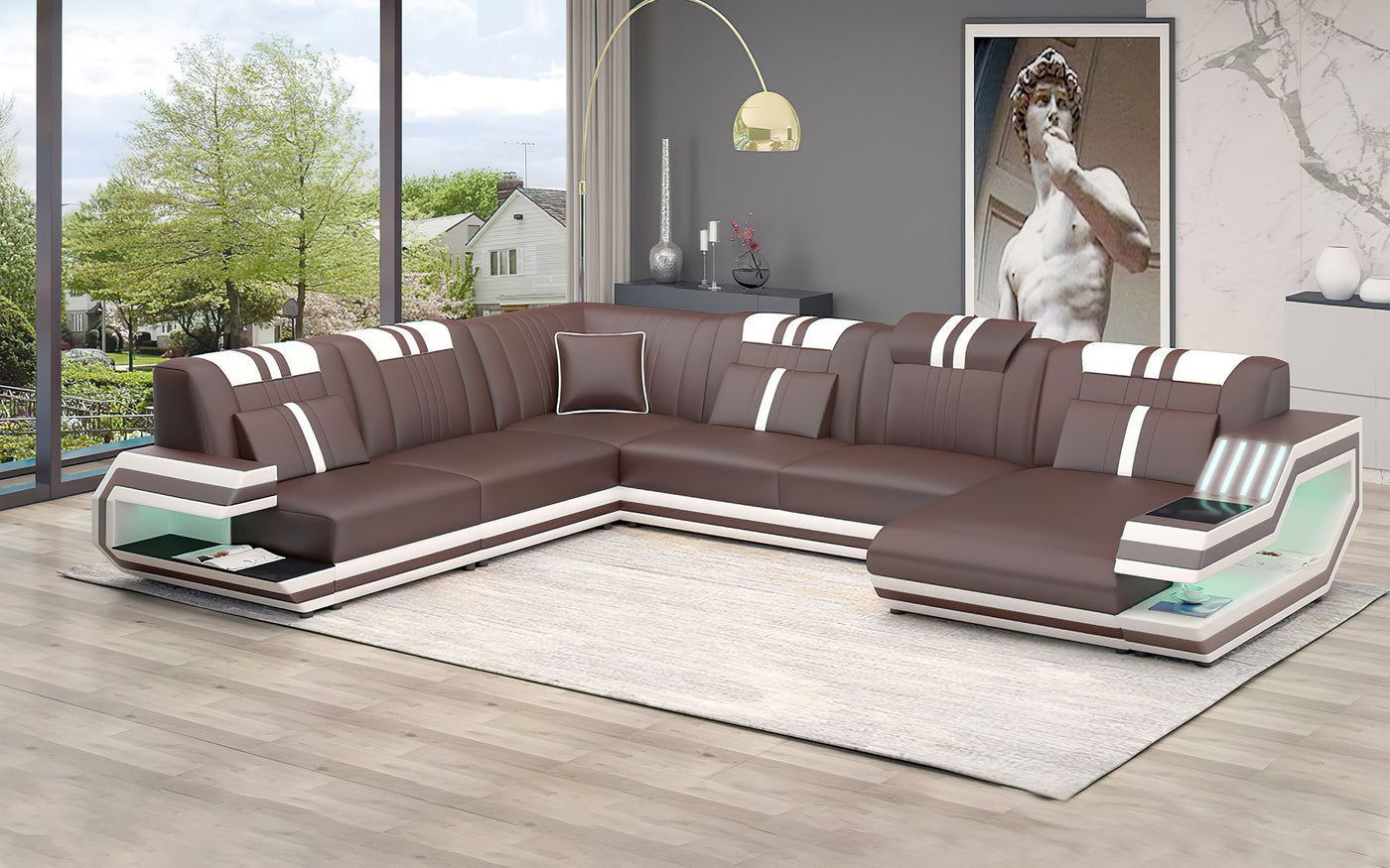 The Celine Leather Sectional with LED Light is available in two-toned or contrasting colors in fabric, Italian leather and bonded leather. It features two storage spaces perfect for books or magazines. The side of this leather sectional are illuminated by a LED light. It can be optionally upgraded to multi-color lights that can be controlled by a wireless remote. Each top headrest is adjustable. Choose your configuration left hand facing or right-hand facing chaise to customize to your desired design. This modern sectional is a stylish and lively addition to your living space. The unique geometric design on the sides of this sectional quickly catch the eye of visitors. To complete the look of your living space we recommend adding the armless chair and coffee table. Cup holders and USB ports are recommended for larger families to optimize maximum enjoyment. An additional bed function makes a great movie night with the family or space for unexpected guests. With the generous size of this sectional, family and friends will gladly socialize in comfort.