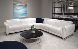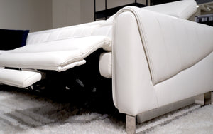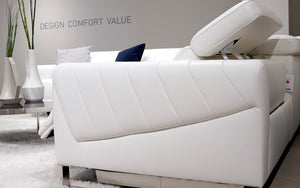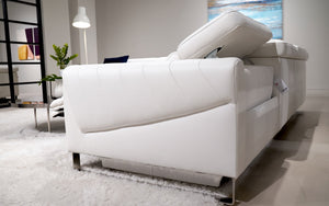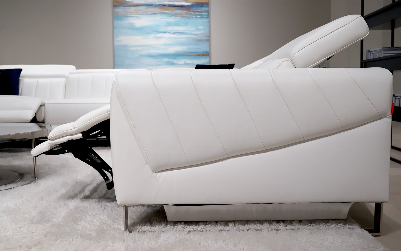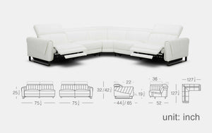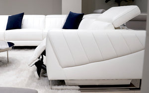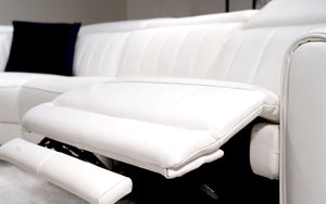 The Haley Modern Leather Sectional with Recliner is made of Italian leather with a modern style. It includes three power reclining chairs, A stylish and sophisticated design combined with the comfort of plush cushions. The sectional is high quality made to be durable, it has four adjustable headrests, and the backrest is very user-friendly. This sofa is ideal for small gatherings and movie nights. Perfect for a contemporary home and lovers of comfortable lounging.