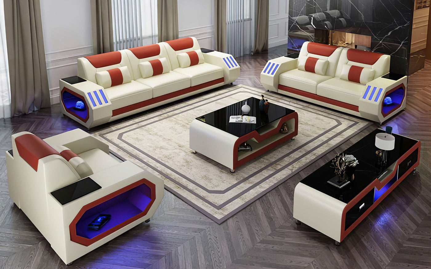 - Default sets Include 1 Sectional (Sofa + Loveseat + Arm Chair), and LED light with the switch+ TV Stand (Orange & White)