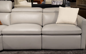 Maison Leather Sectional Sofa With Recliners is fully modular allowing you to have multiple options when configuring it to your room's space. The leather sectional features 3 powered recliners and headrests for maximum comfort. Crafted from premium top-grain leather all around. This 6-piece sectional features a convenient console with two cup holders plus storage, 2 end recliners, 1 armless recliner, 1 stationary arm less chair , 1 plush corner cushion, 1 console table , solid oak frame to ensure long lasting use. Available in grey and beige color