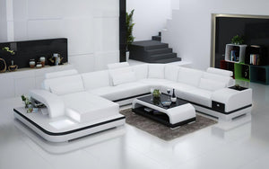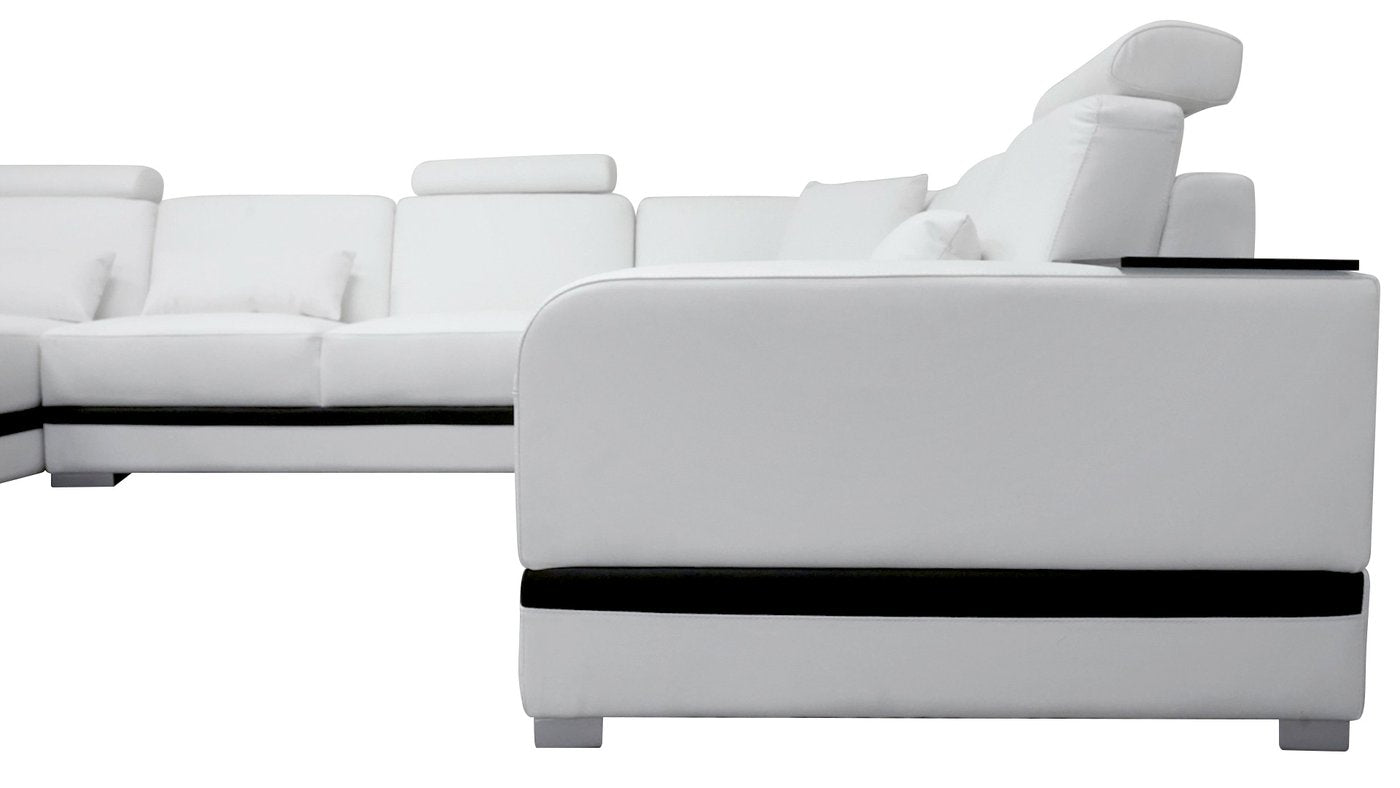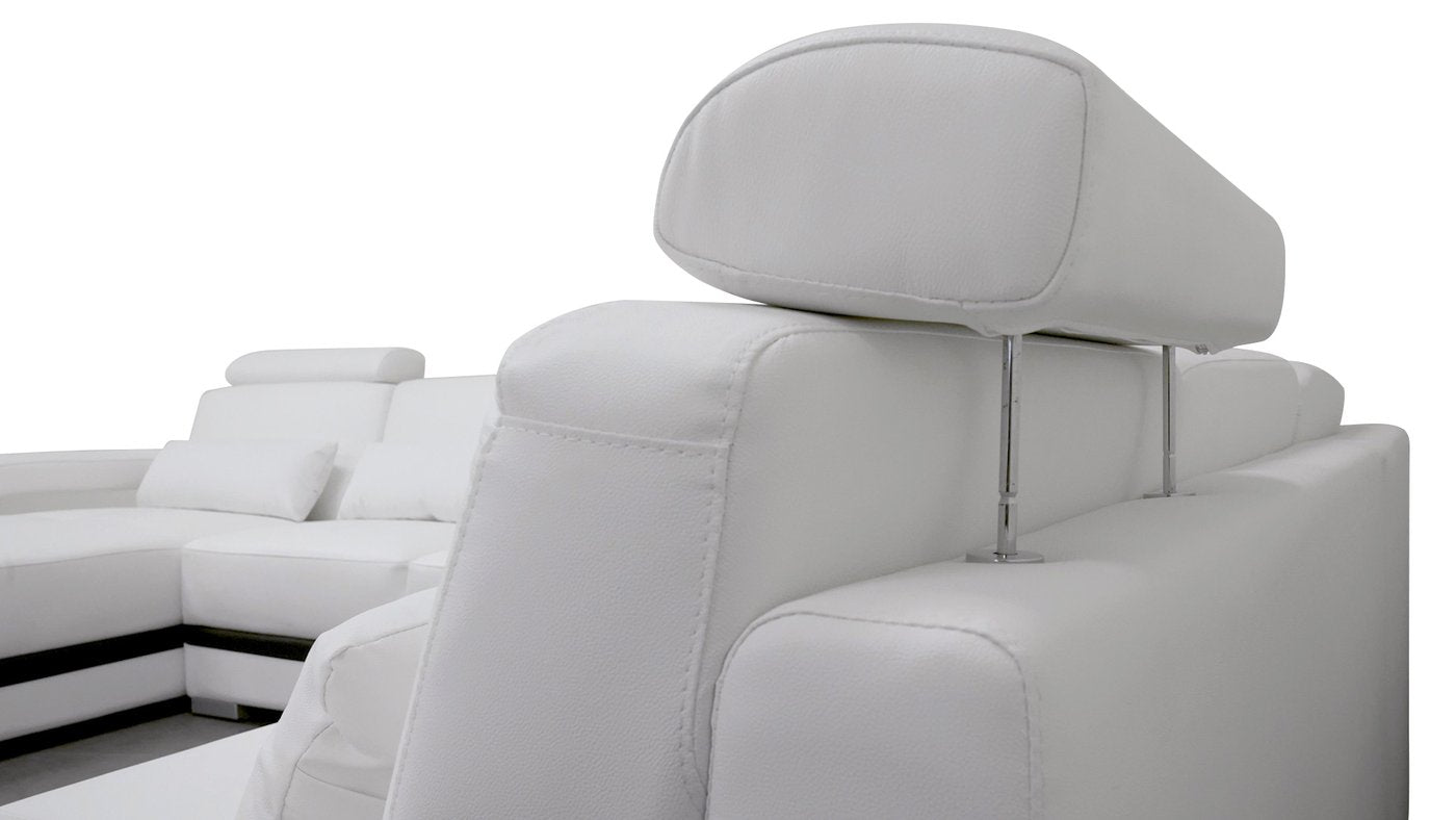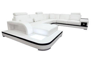The Everly Leather Sectional with LED lighting is handmade with genuine Italian or bonded leather. This large leather couch is sleek and suits any modern living space. Its modular design can be customized to a configuration that fits your unique space - whether it is your living room or family room. Armrests are included to hold drinks and personal items. Each top headrest is adjustable. The storage space alongside the chaise is big enough to display books or decorative items. The spacious chaise is perfect to lay down and rest after a busy day. There is a small console to store away remotes and coasters or hold your TV snacks. The sides of this leather couch are illuminated by multi-color lights controlled by a wireless remote. Choose your configuration left hand facing or right-hand facing chaise to customize to your desired design. This sleek, comfortable sectional is a must have for every contemporary home. To complete the look of your living space we recommend adding the armless chair and coffee table. Cup holders and USB ports are recommended for larger families to optimize maximum enjoyment. An additional bed function makes a great movie night with the family or space for unexpected guests. With the generous size of this sectional, family and friends will gladly socialize in comfort.