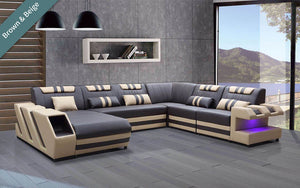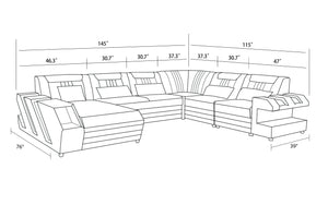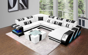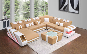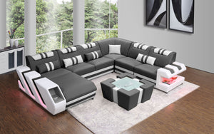 The Neptune Modern Leather Sectional with LED lighting is available in two-toned or contrasting colors in Italian leather and bonded leather. It features two storage spaces perfect for books or magazines. The side of this leather couch are illuminated by a LED light. It can be optionally upgraded to multi-color lights that can be controlled by a wireless remote. Each top headrest is adjustable. Choose your configuration left hand facing or right-hand facing chaise to customize to your desired design. This modern couch is a stylish and lively addition to your living space. The unique angular design on the sides of this sectional quickly catch the eye of visitors. To complete the look of your living space we recommend adding the ottoman and coffee table. Cup holders and USB ports are recommended for larger families to optimize maximum enjoyment. An additional bed function makes a great movie night with the family or space for unexpected guests. With the generous size of this sectional, family and friends will gladly socialize in comfort.
