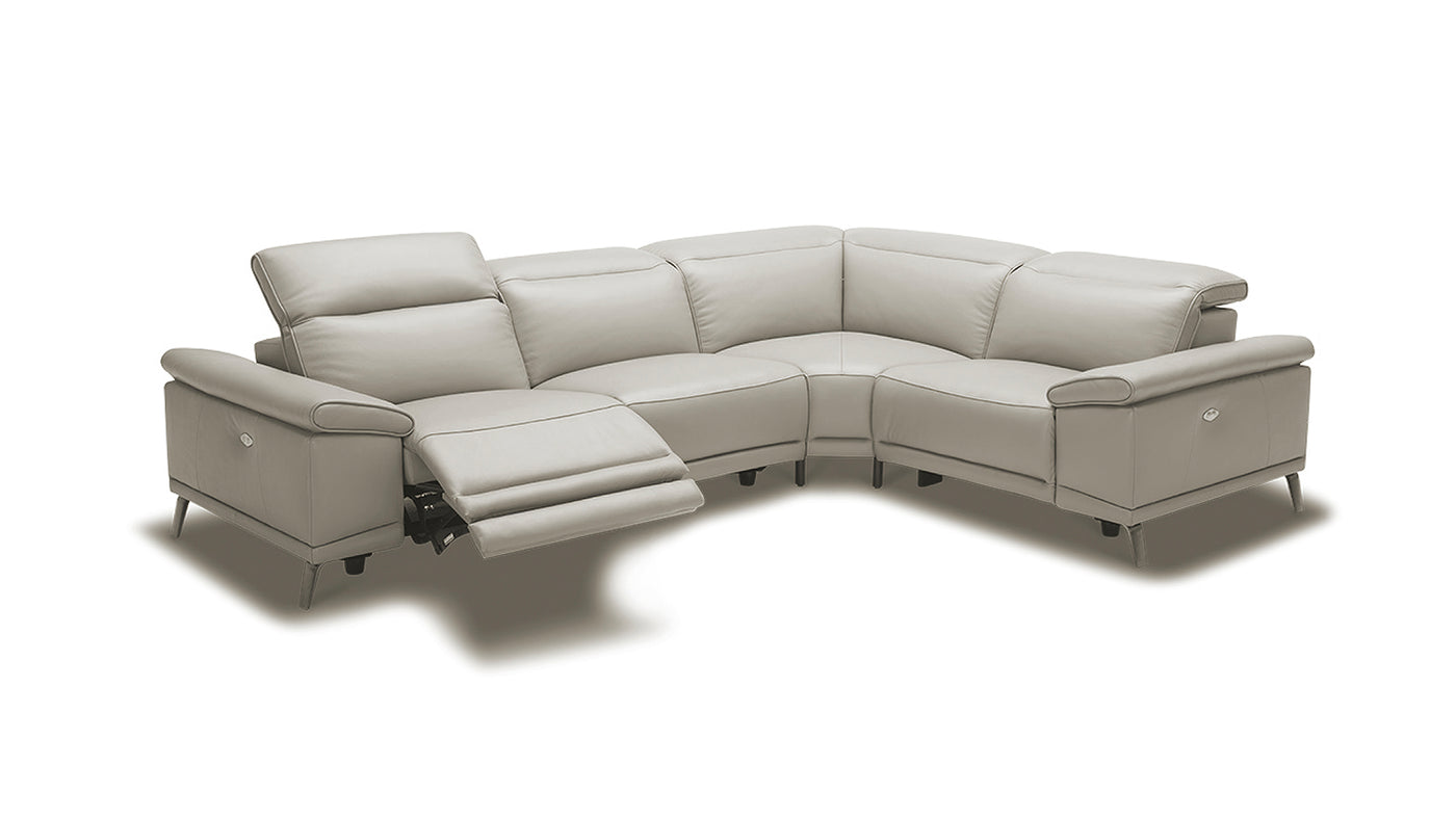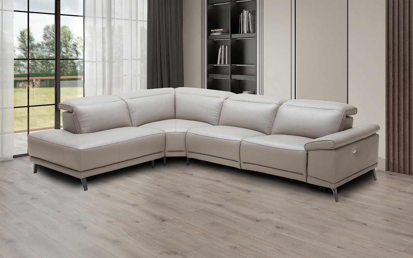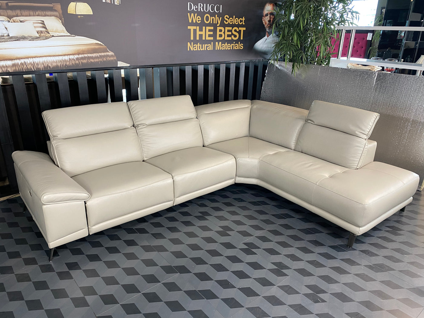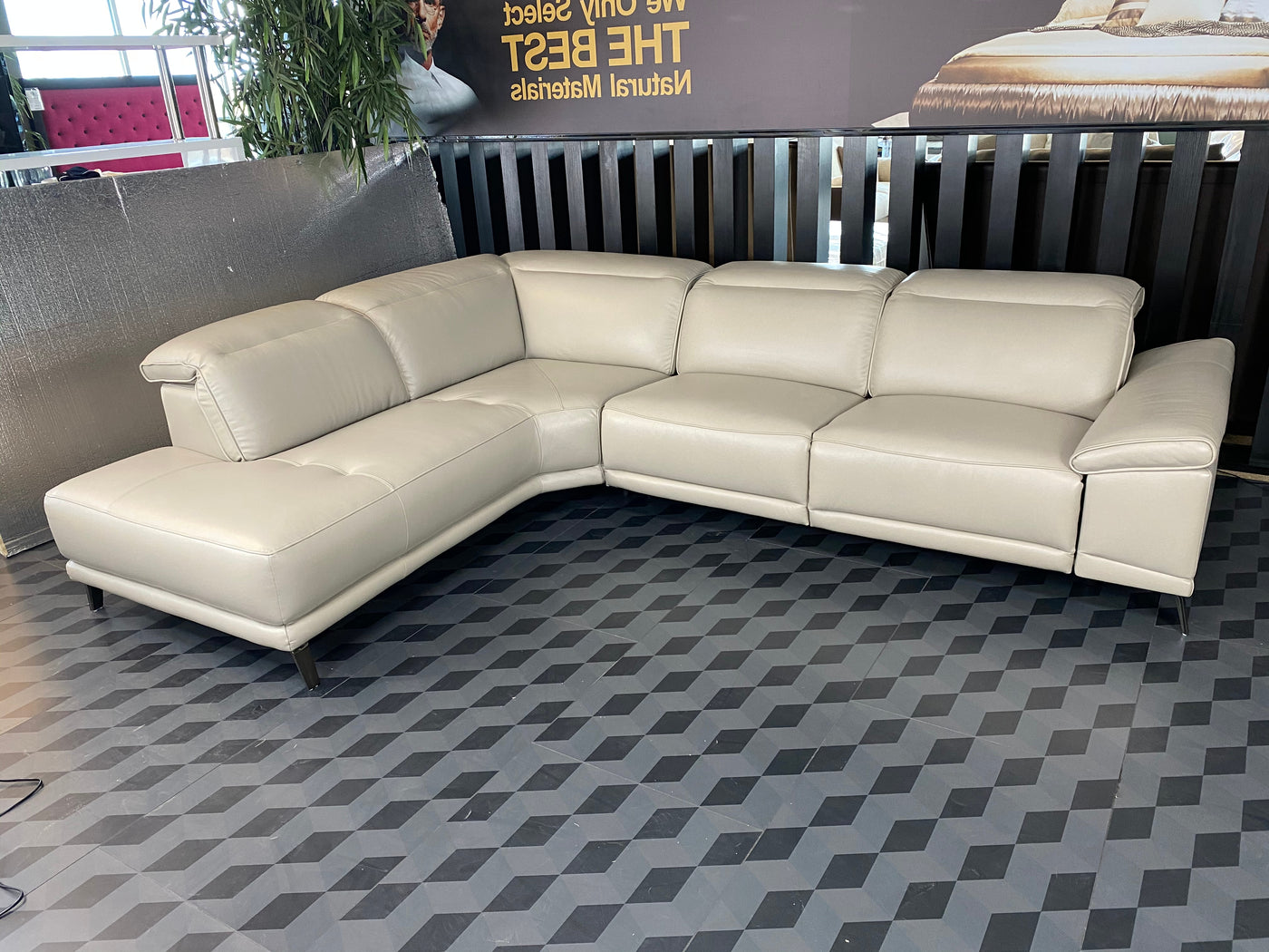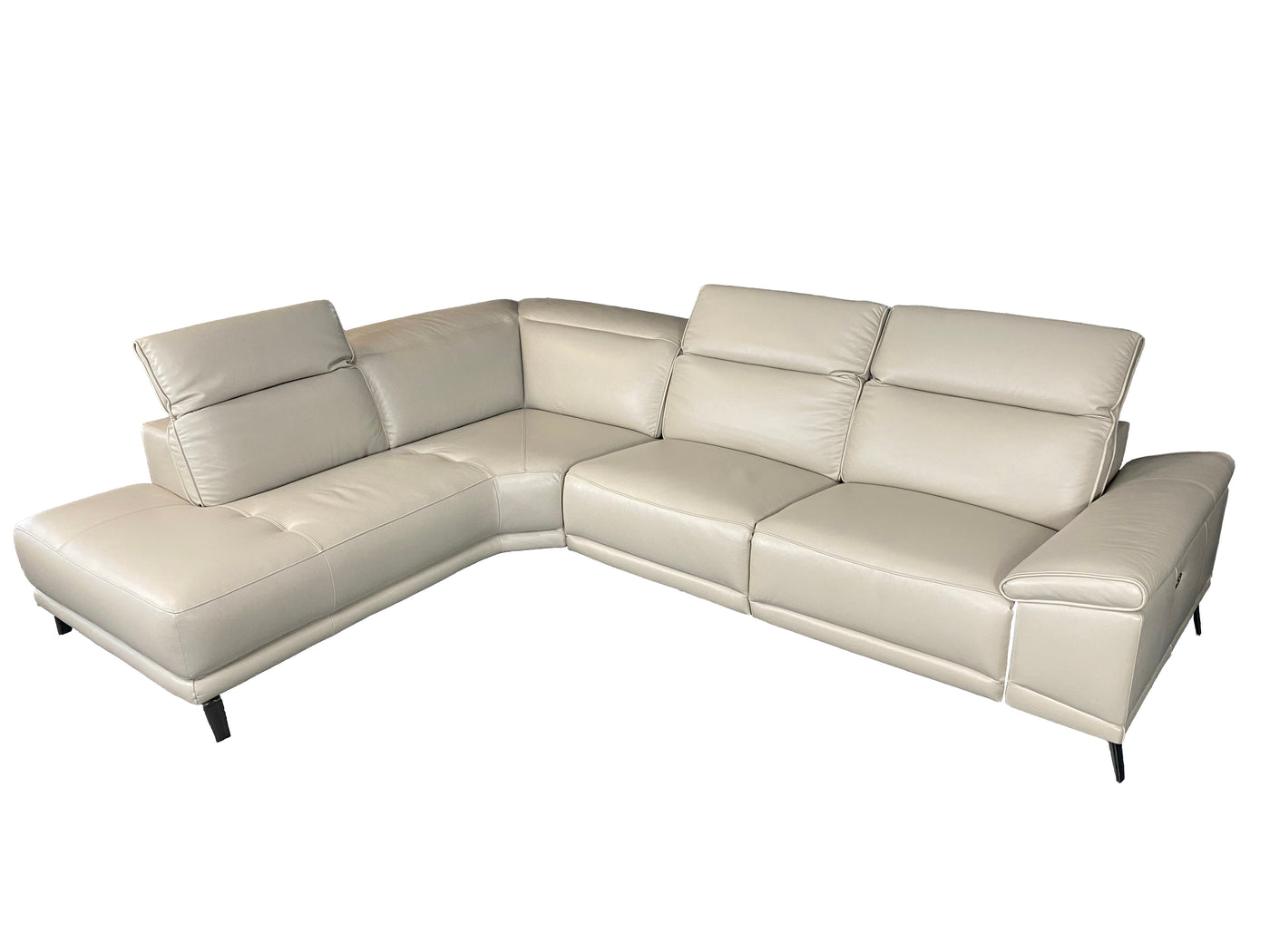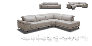 Made with the best top grain leather, this contemporary 2 piece sectional combines form and function for a unique couch. The sleek design brings a sophisticated and inviting look to any modern living space. It features one side powered recliner with multiple adjustable headrests. The legs are made of durable stainless steel for maximum support and longevity.