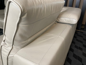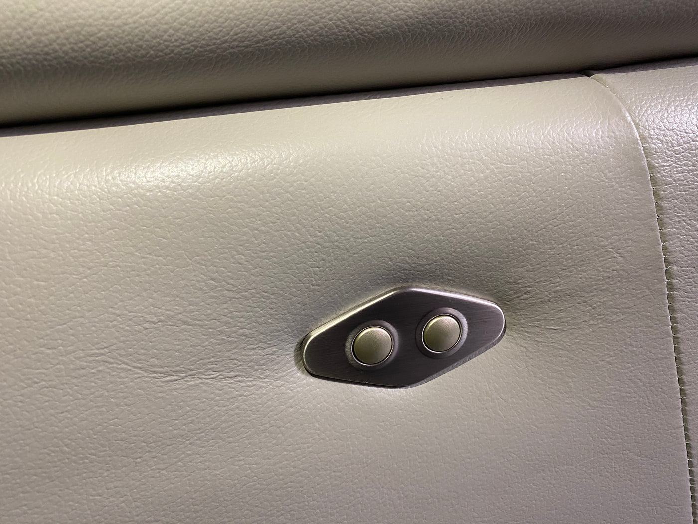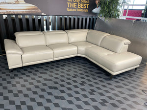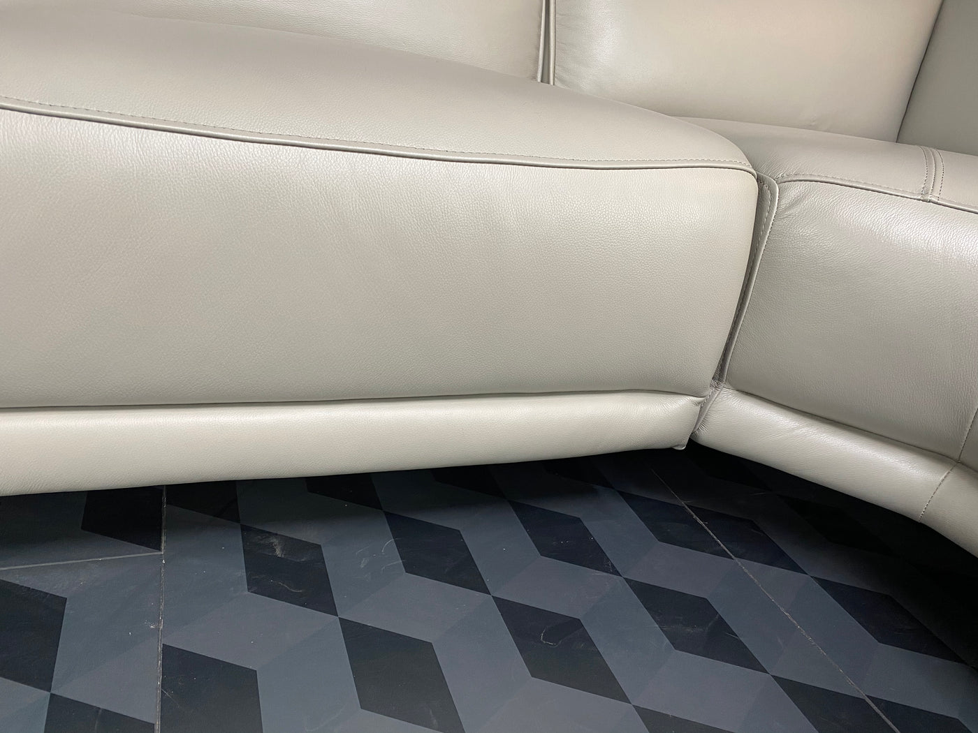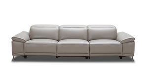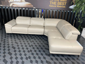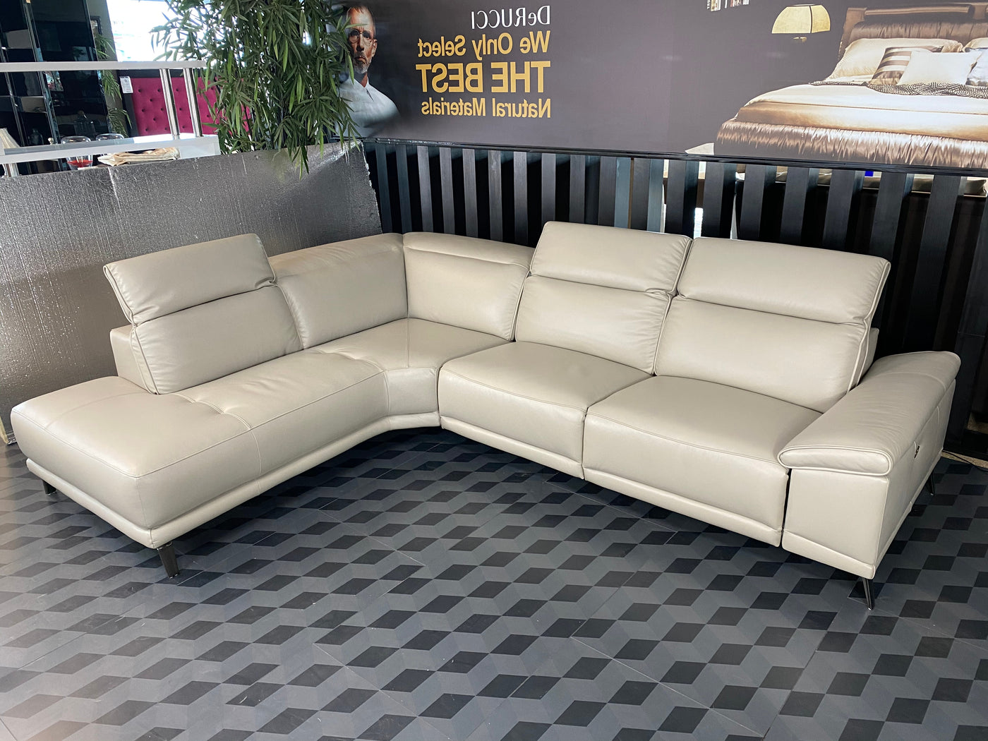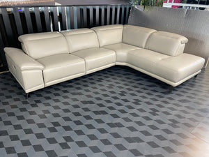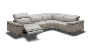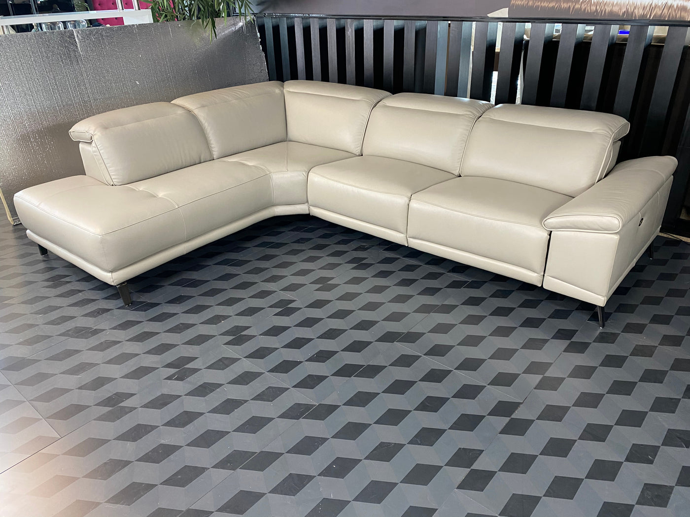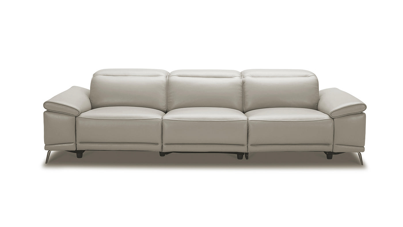 Made with the best top grain leather, this contemporary 2 piece sectional combines form and function for a unique couch. The sleek design brings a sophisticated and inviting look to any modern living space. It features one side powered recliner with multiple adjustable headrests. The legs are made of durable stainless steel for maximum support and longevity.