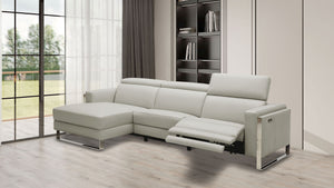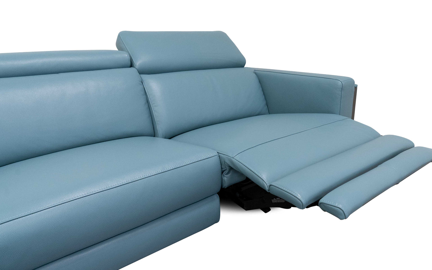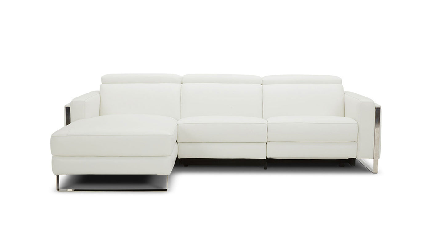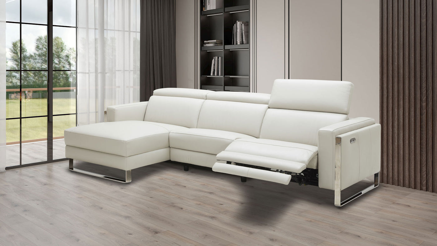 Sink into our modern top grain leather sofa sectional. Seating flexibility for comfort featuring a full power reclining seat on one side, hidden hand power mechanism for the middle headrest and powdered headrest in the chaise. This sectional is perfect for a contemporary home and will accent your decorative pieces beautifully. Stainless steel legs in matte dark grey finish completes the contemporary design of the sectional.