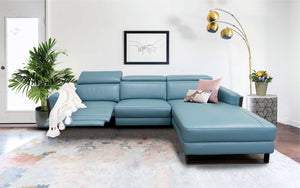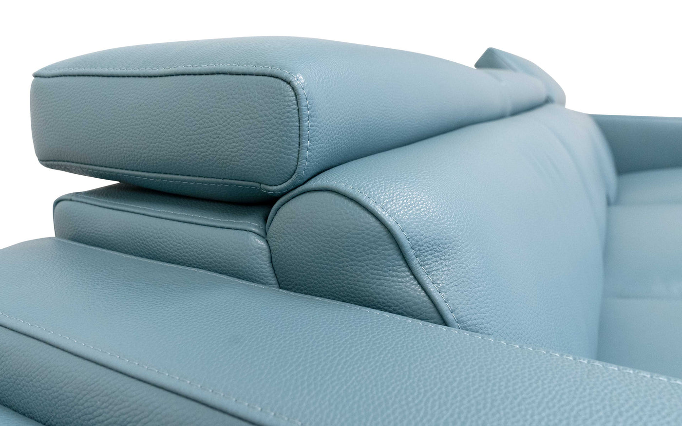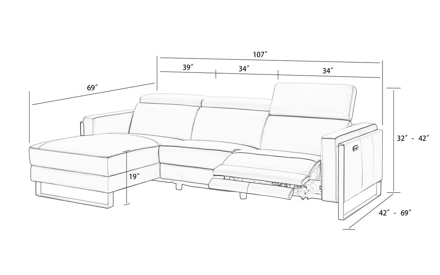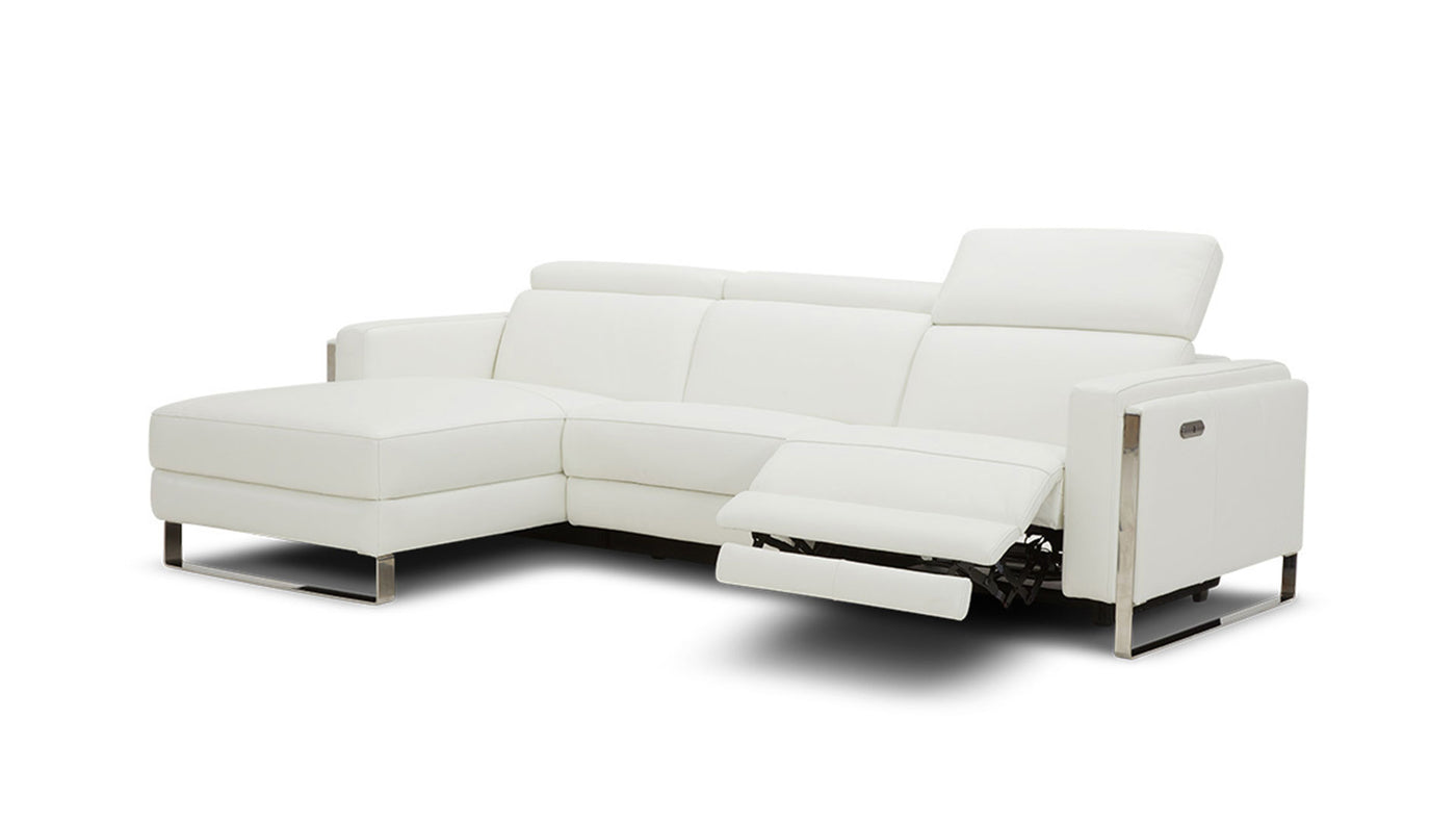 Sink into our modern top grain leather sofa sectional. Seating flexibility for comfort featuring a full power reclining seat on one side, hidden hand power mechanism for the middle headrest and powdered headrest in the chaise. This sectional is perfect for a contemporary home and will accent your decorative pieces beautifully. Stainless steel legs in matte dark grey finish completes the contemporary design of the sectional.