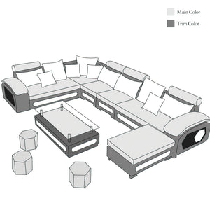 The Selena Modular Tufted Sectional is our top seller, and for good reason. This large sectional is informal yet stylish and suits any modern living space. Its modular design can be customized to a configuration that fits your unique space - whether it is your living room or family room. The leather and fabric combination add charm and interest to the design. The plush backrest cushions are attached to adjustable cylindrical bolster pillows that help keep them in place and prevent them from sliding down. The 5" foam seat cushions are comfortably firm and can be washed along with the backrest. Detachable padded armrests add more comfort or can be taken off to create a more formal look. Storage on both ends of the sectional add style and function as the 4-piece octagonal shape stools can be included. Frame material is made of solid wood to ensure you have a long-lasting sectional. This sleek, modern sectional is a must have for every contemporary home. To complete the look of your living space we recommend adding the armless chair and coffee table. Cup holders and USB ports are recommended for larger families to optimize maximum enjoyment. An additional bed function makes a great movie night with the family or space for unexpected guests. With the generous size of this sectional, family and friends will gladly socialize in comfort.